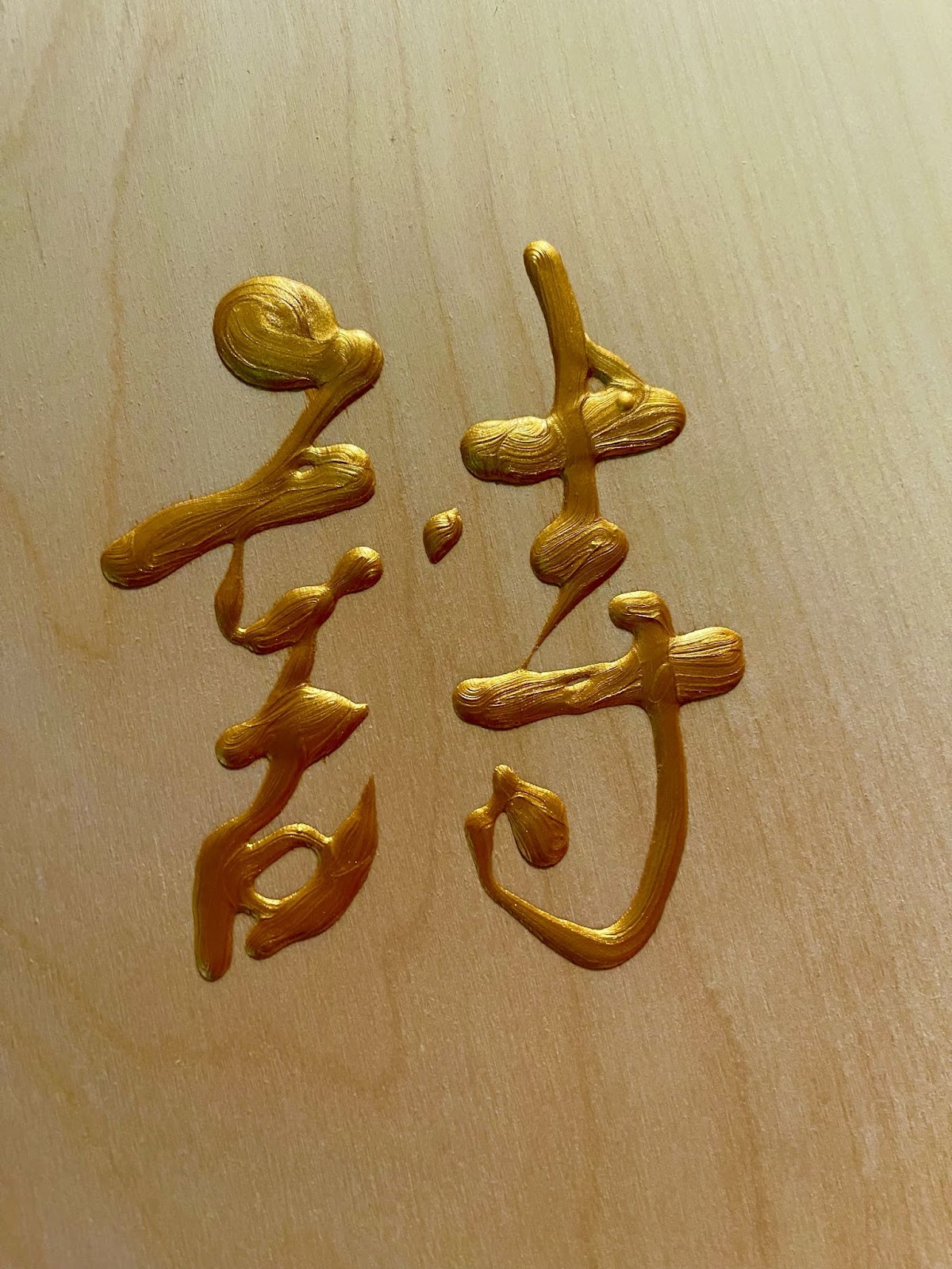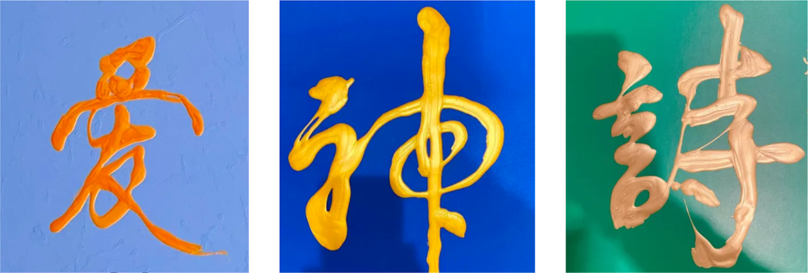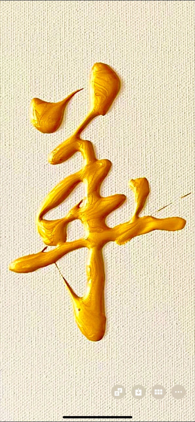 五、遛金立体书法是可以铺垫图案,书法和铺垫叠加,在丙烯自然形成的肌理之上,进一步增加作品笔划内部肌理的立体质感和肌理的丰富感。