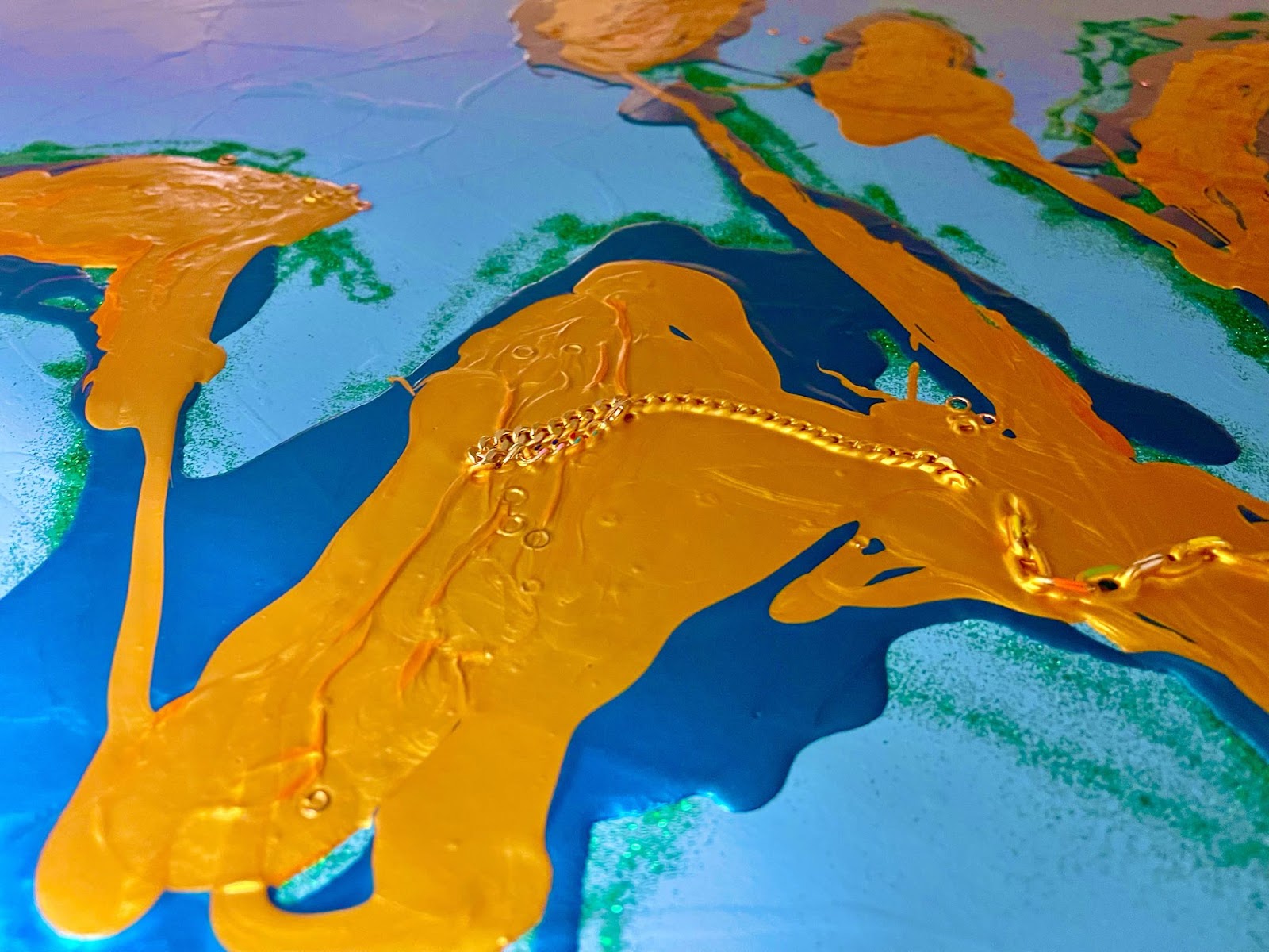 下图在遛金字体上增加了项链,丝线和零碎的金环,以增加立体书法的质感和肌理的多彩,丰富。