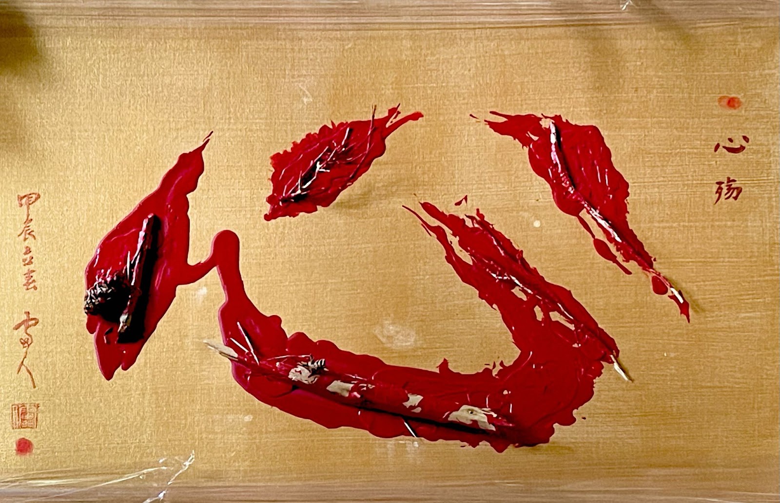 四、雷人先生独创的这种艺术形式,还可以将各种物理材料融入作品中,如金属、宝石乃至个人物品,构成现代综合材料艺术作品。以表达书法之外的更加丰富的主题和画面审美效果。