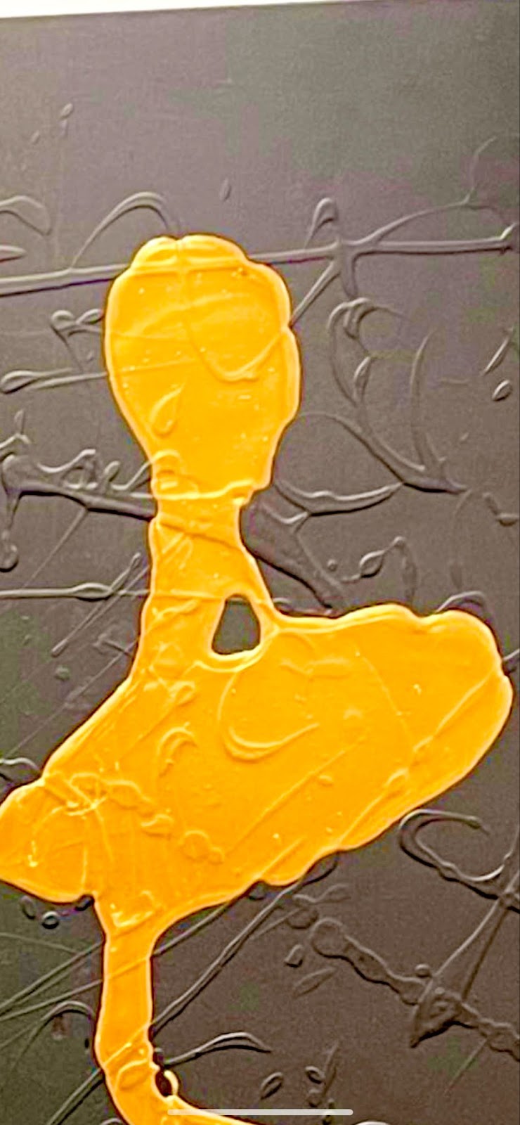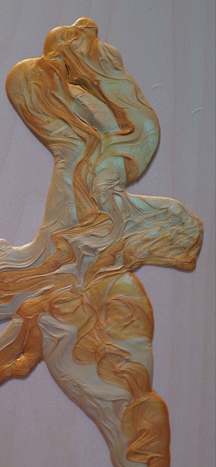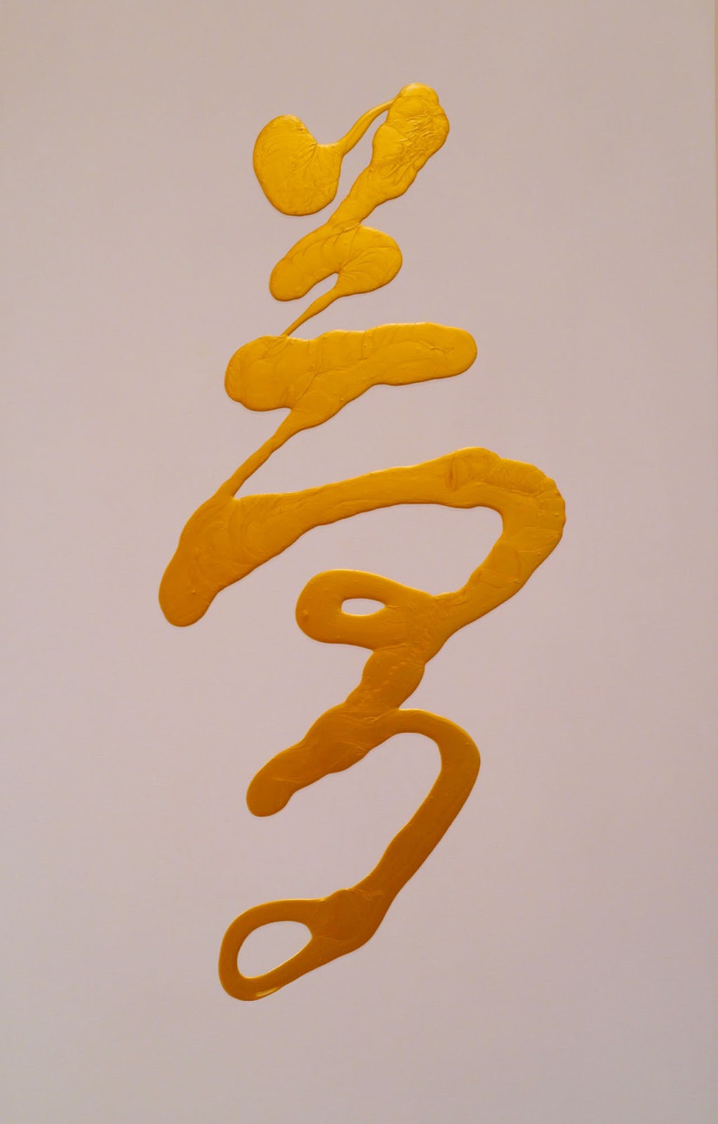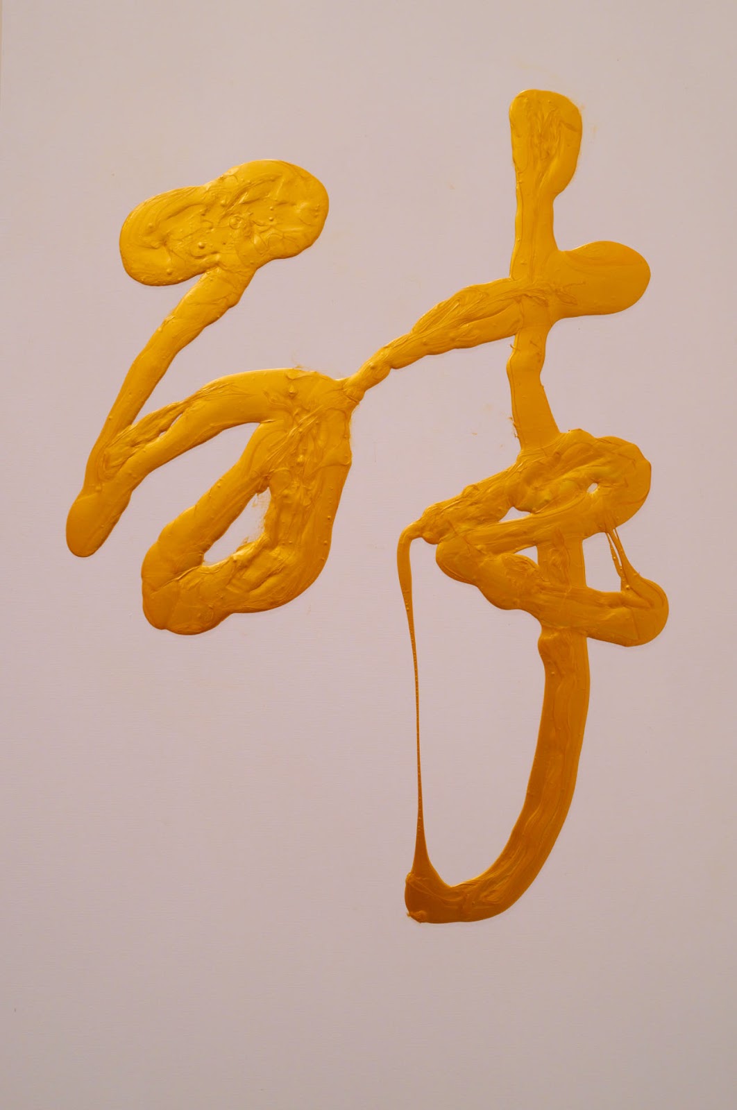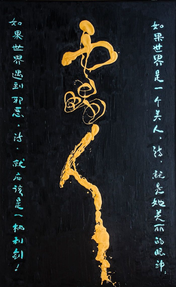 用丙烯遛成的立体书法表面,天成肌理之丰富,妙不可言!不仅传统水墨书法不可企及,所有的现行艺术形式,都难以表达如此丰富,自然,美妙,变幻无穷的画面形象。