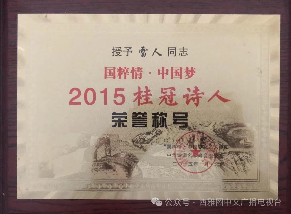 被中华诗词学会授予桂冠诗人称号,2015年10月。