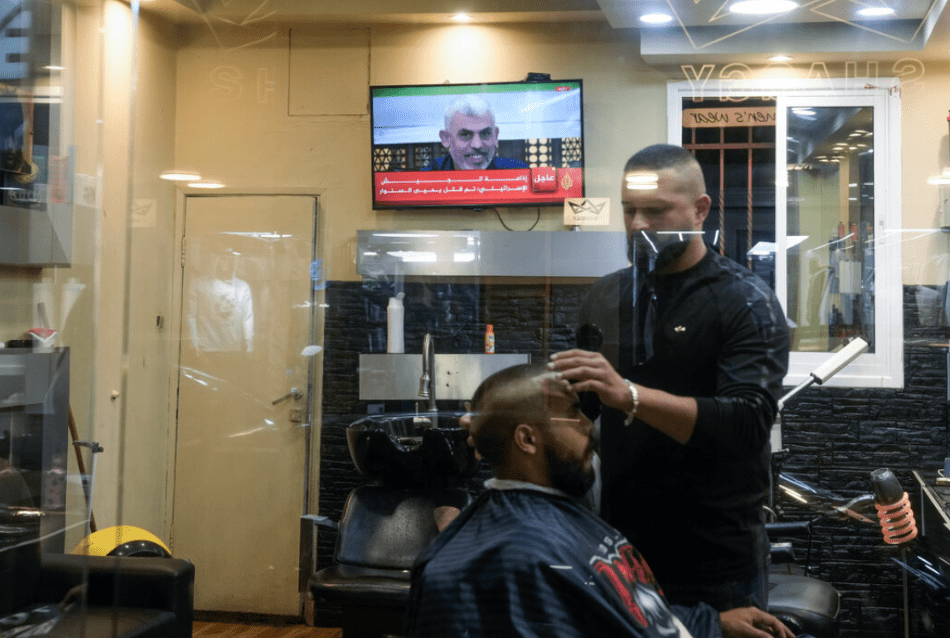 (周四,约旦河西岸城市伯利恒一家理发店电视上的辛瓦尔画面。Mahmoud Illean/Associated Press)