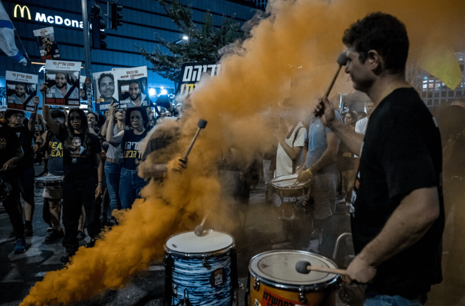 (周四,支持在加沙被扣以色列人质家属的示威者在特拉维夫国防部外集会。 Sergey Ponomarev for The New York Times)
