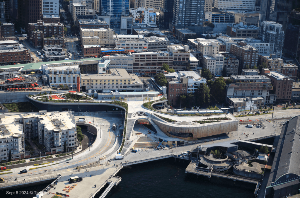 滨水公园?你听说过吗?不清楚。那你知道自从1962年西雅图市为了世博会的举办而修建西雅图中心后,在这半个多世纪以来,什么是本市最大的公共市政建设项目?答案只有一个:位于西雅图市中心海边的滨水公园。这个地方过去有丑陋的高架桥穿过,在视线上切断了与市中心其它区域的连接,拥挤杂乱、破旧肮脏,大量的流浪汉、瘾君子等盘踞在此,让人们唯恐避之不及。2001年的地震,使阿拉斯加道高架桥及其护墙受到了损坏,这迫使高架桥关闭进行紧急修复,并最终促成了用SR 99隧道和扩建的阿拉斯加道取代高架桥的决定,新隧道的建设地点位于旧高架桥的原址上。新的隧道设计能够抵御9.0级地震。此次地震还损毁了第58号码头。于是,从2009年开始,改建和重建这占地20英亩的滨水公园项目被正式地提上了议事日程。在华州政府同意拆除高架桥后,该如何规划改建这整个地区呢?