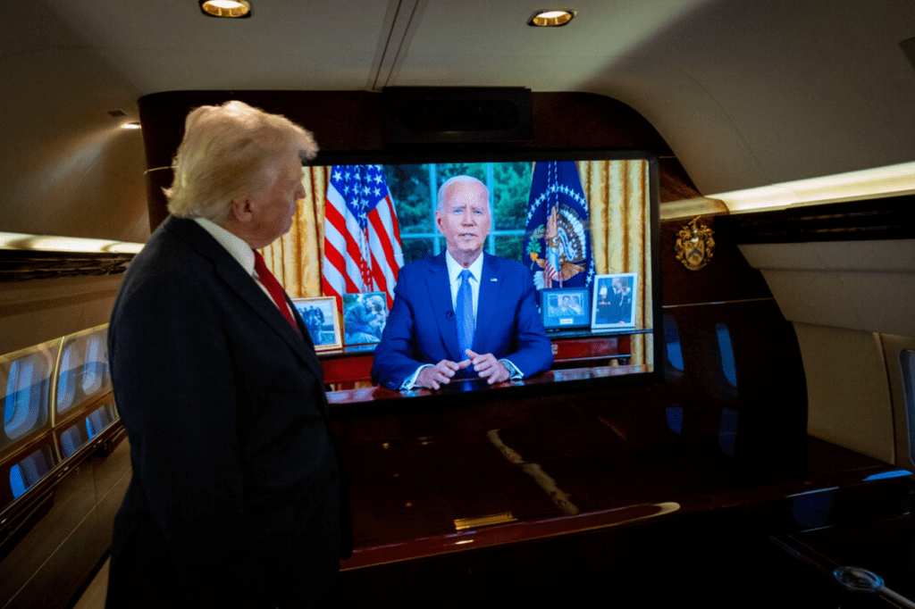 (特朗普在飞机上观看了拜登总统宣布退出总统选举的消息。Doug Mills/The New York Times)