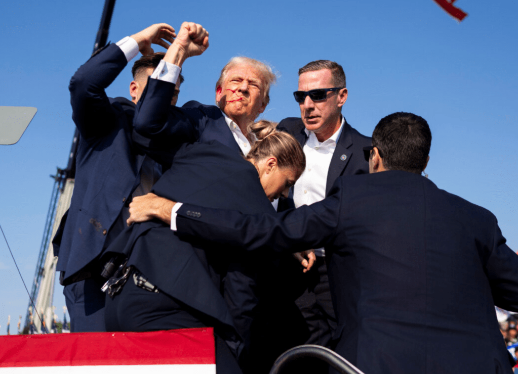 (7月13日,在宾夕法尼亚州巴特勒举行的竞选集会上,特朗普的耳朵被子弹擦伤,他举起拳头以示反抗。