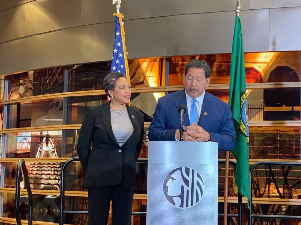 (11月13日,西雅图市长布鲁斯.哈雷尔携夫人在西雅图市政厅承认竞选连任失败,并向新任市长喊话)