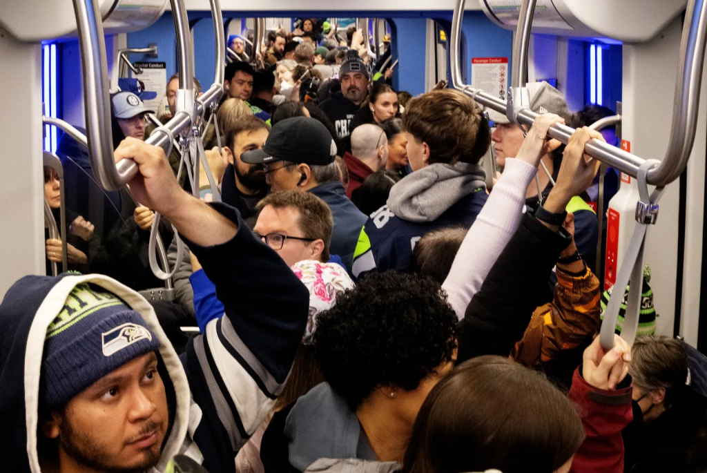 在西雅图的轻轨内,从早上第一班车开始,就挤满了前往市中心的海鹰球迷。