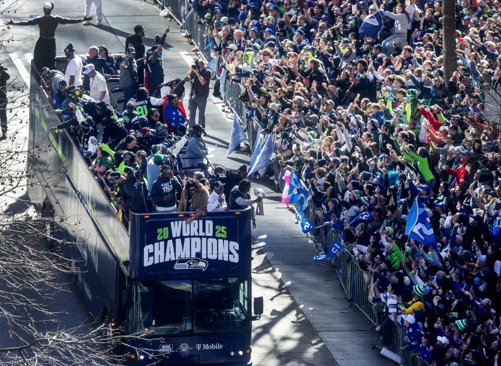 而在游行尾声,仍有球迷爬上西雅图中心附近一家7-Eleven屋顶等待最后车辆经过。广播随即提醒观众不要追随车队进入撤离区。