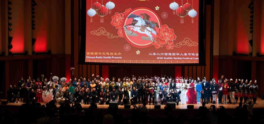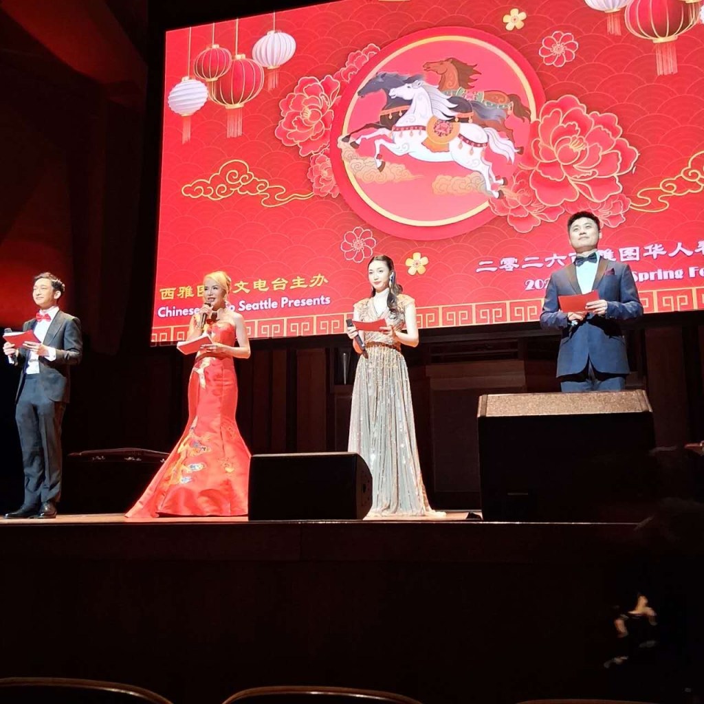 2026年2月8日晚,由西雅图中文电台主办,宛儒艺术中心、4Culture、ArtsFund协办的2026年西雅图华人春晚,为大西雅图地区华人社区带来“双喜临门”的难忘夜晚。晚会群星璀璨,阵容豪华。中国著名魔术艺术家孙峥、中国国际一级杂技演员赵春立与李佳夫妇、邓丽君文教基金会认定的“小邓丽君”张瀞云、CCTV《星光大道》知名少年歌手王泓翔、亚洲创造营学员李诗恬、宝丽金签约歌手王佩,以及来自西雅图的蒙古姐弟乐队ZJE,与大西雅图地区十多个演出团体和个人,共计300余名演员登台献艺。整场演出阵容多元、风格交融,既有世界级艺术家的专业呈现,也有本地新秀的青春风采,充分展现了华人文化在海外的活力与传承。